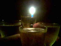 La velada comenzó con una picada, cervezas y pizzas varias, 1) una grande mitad de: salsa de tomate, mozzarella, cebolla, champignones, panceta ahumada y oliva y la otra mitad de: tomate, cantimpalo, mozzarella, morrones, hojas de tomate y oliva, 2) una mediana de: jamón crudo, mozzarella, rúcula y queso parmesano; todo matizado con muy buena música, hasta que... ¡se cortó la luz por más de una hora! Pero nada impediría seguir festejando, así que brindamos con champán bien frapé a la luz de una vela improvisada por un ¡magiclick! :D